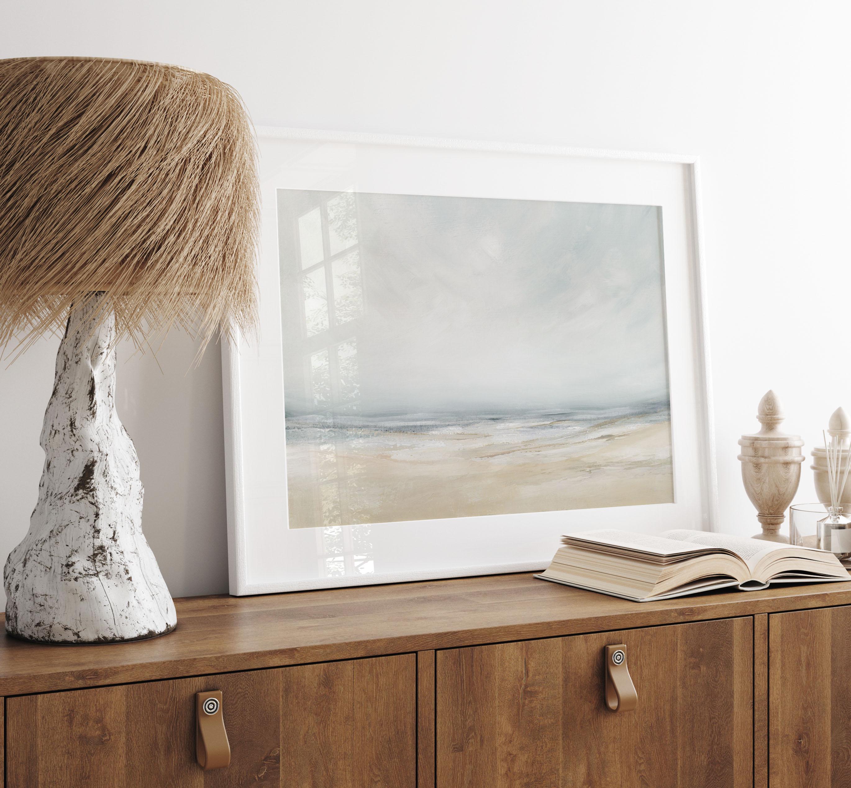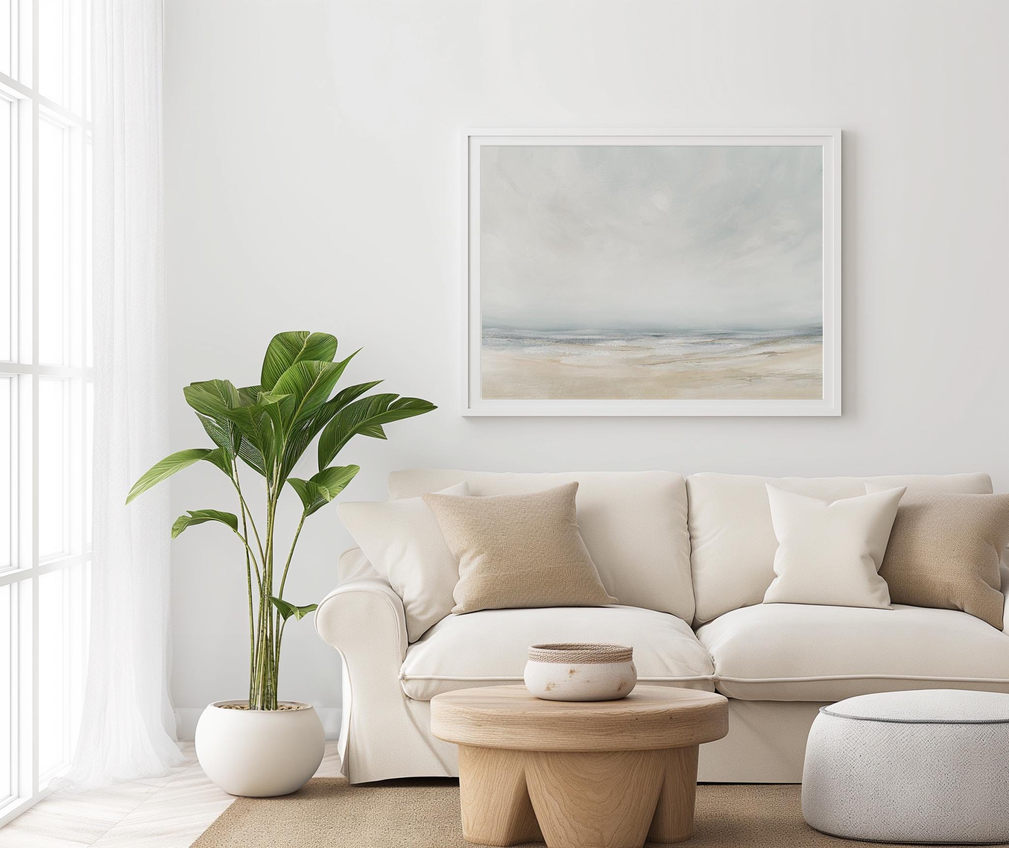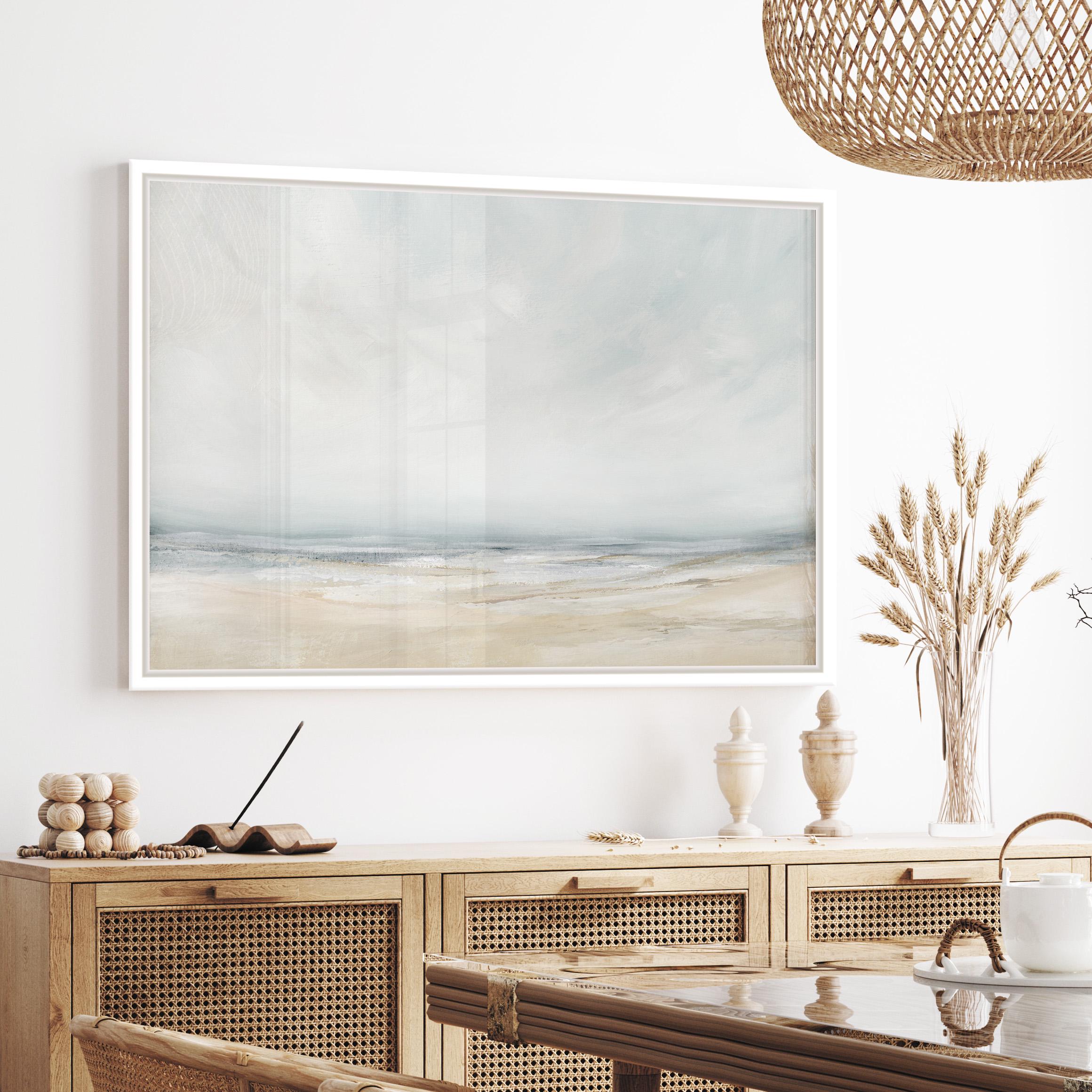 A calming coastal landscape with soft, muted blue/grey and sandy tones, perfect for your modern home.