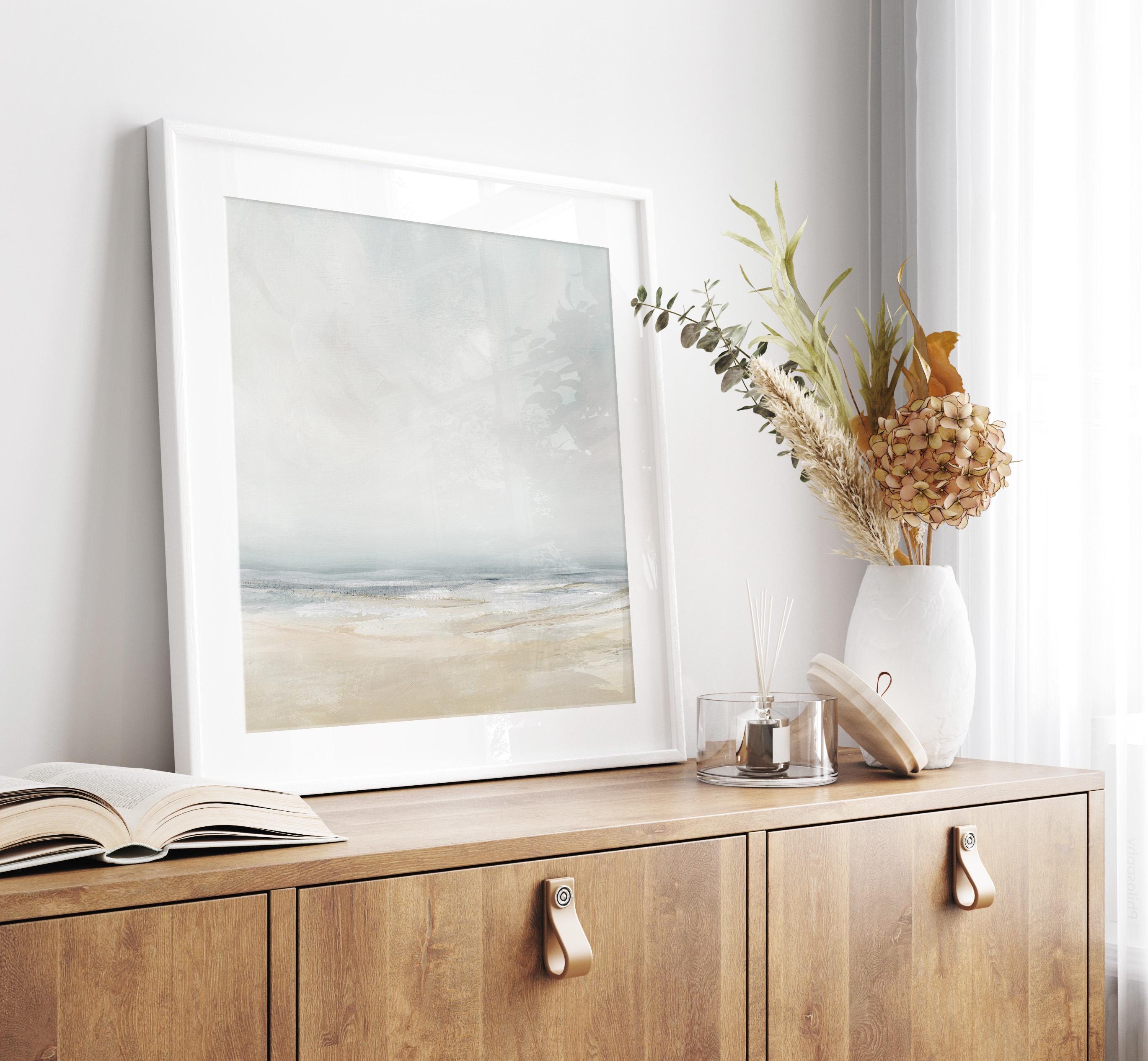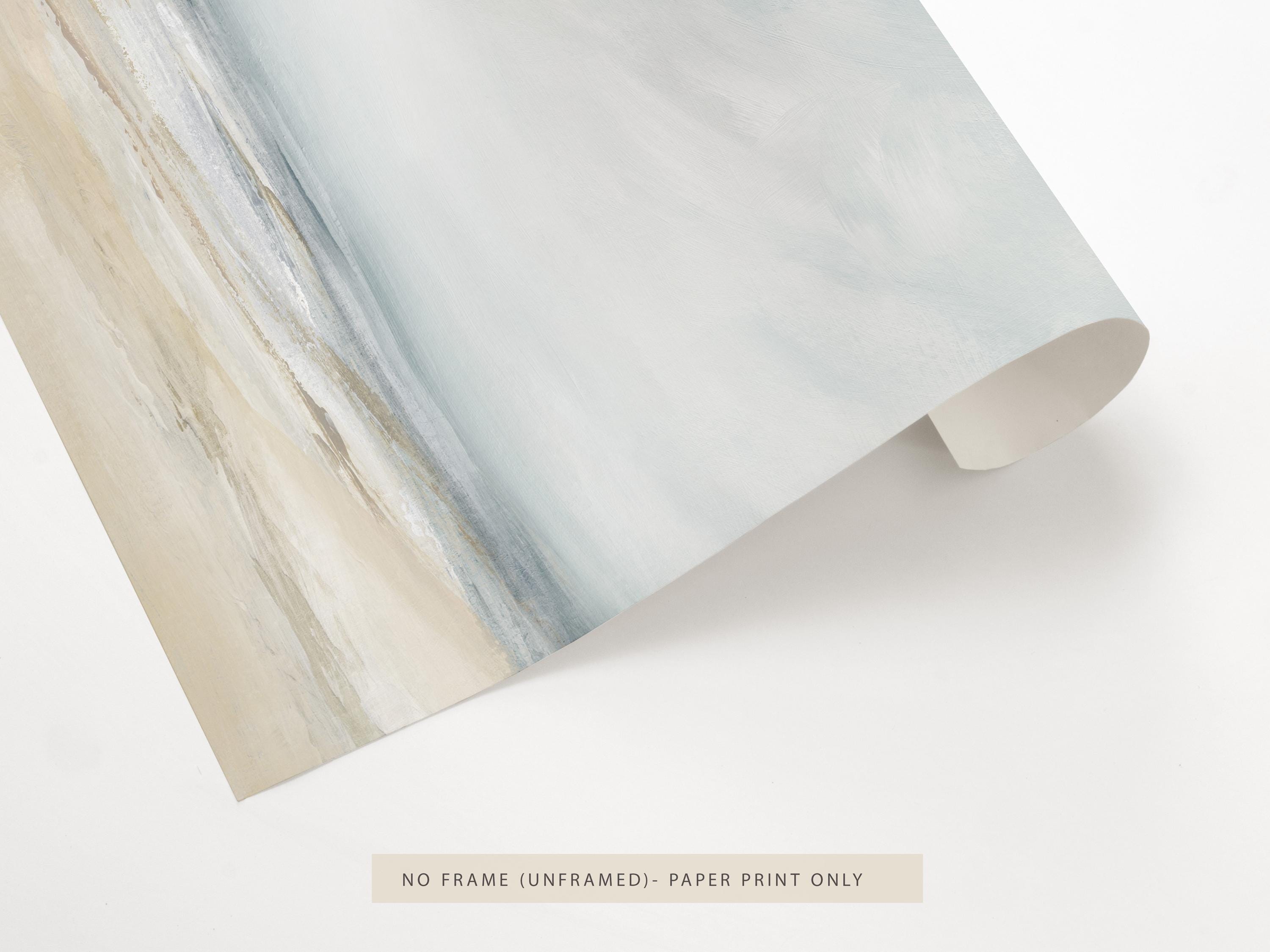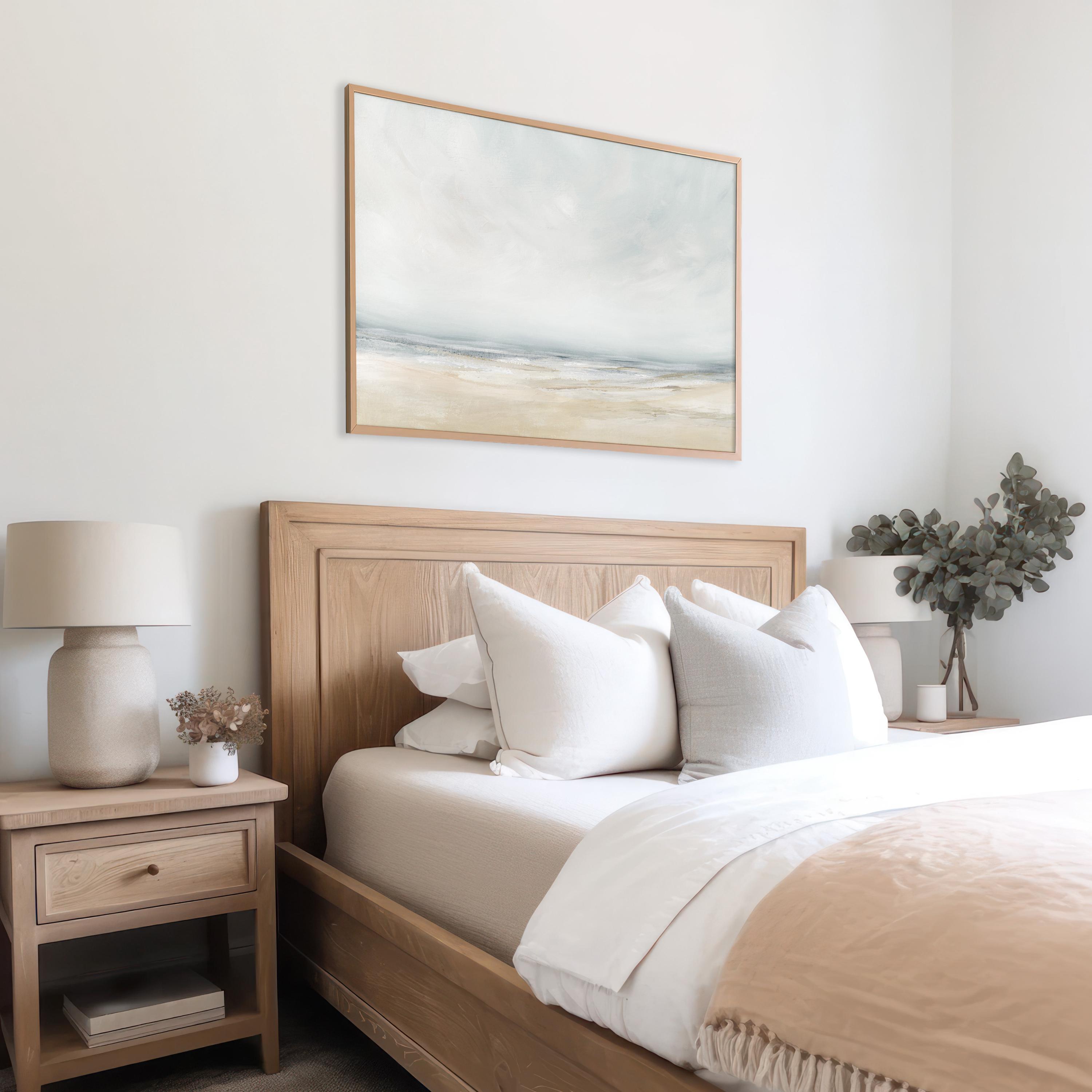 A calming coastal landscape with soft, muted blue/grey and sandy tones, perfect for your modern home.