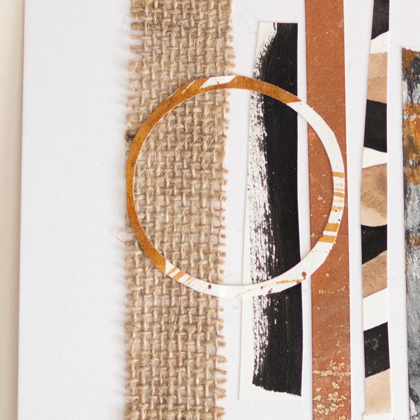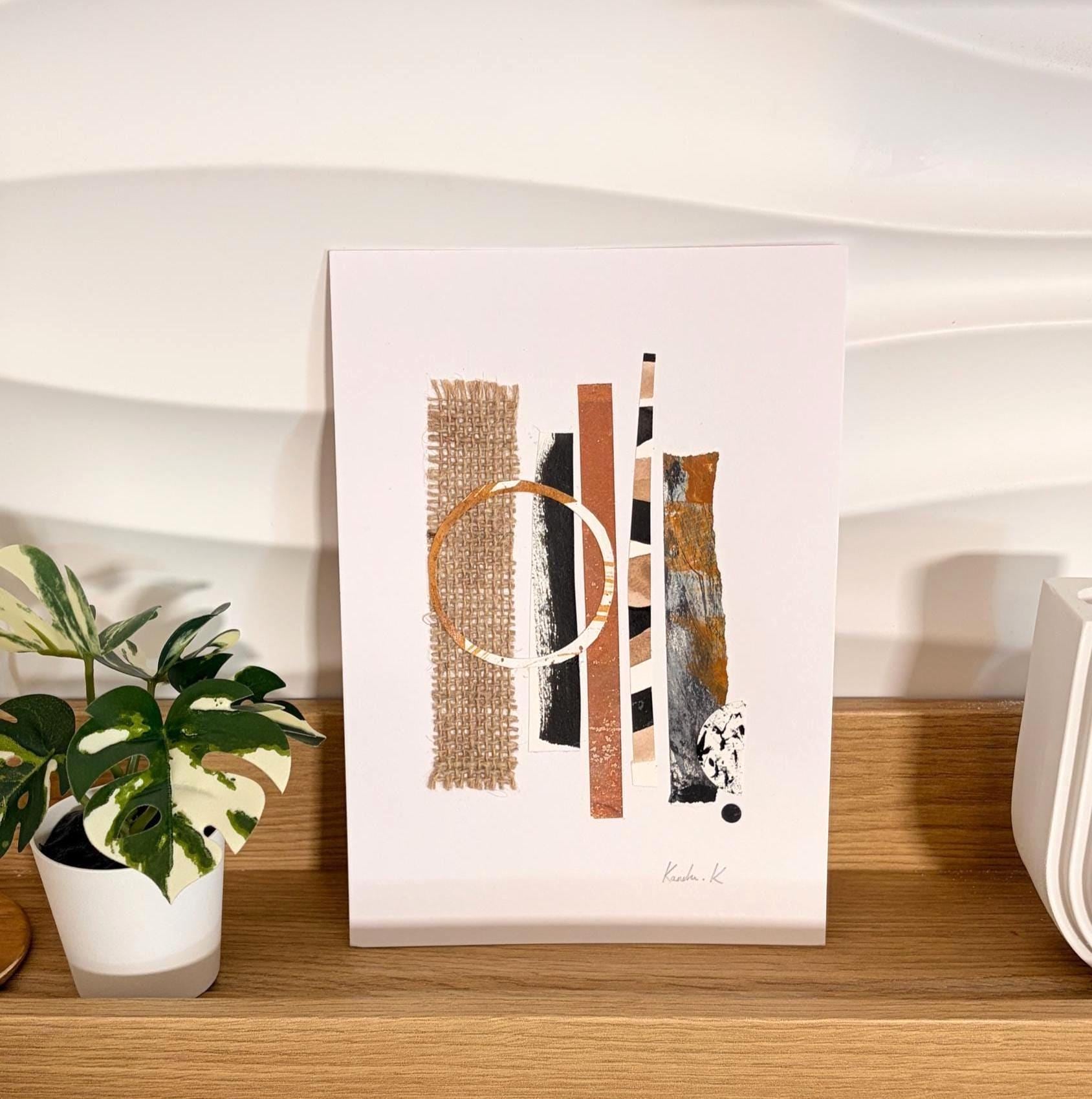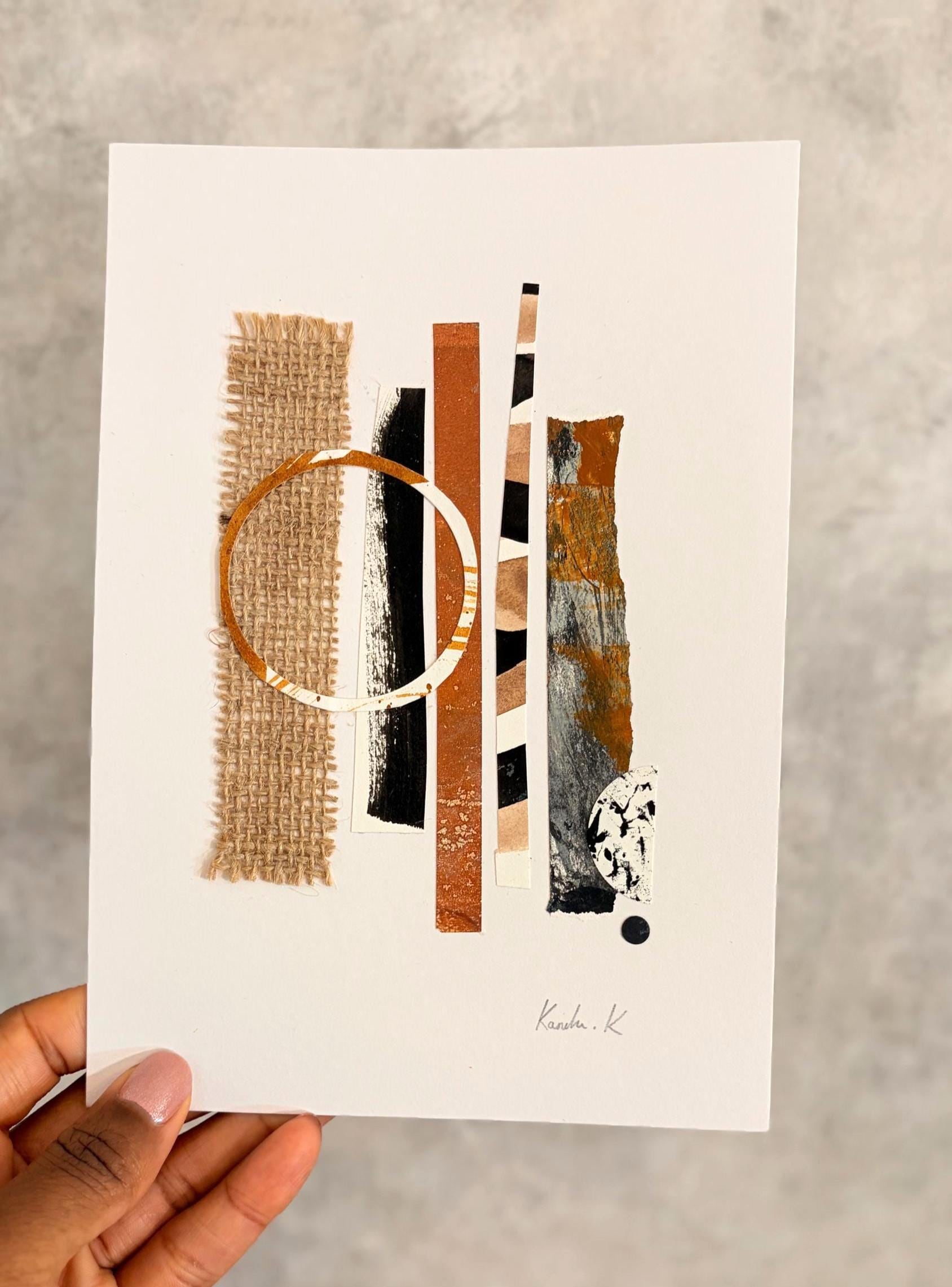 An original abstract collage on card. Made using hand painted & hand textured papers with burlap fabric to construct one-of-a-kind artwork perfect for those who love modern simplicity and earthy tones.